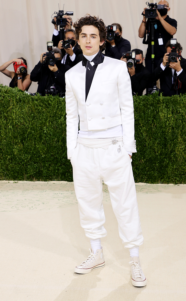 Co-host Timothée Chalamet rocked sweats and Converse on the 2021 Met Gala red carpet.